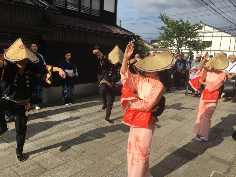 傘の下からチラッと見える顔、三味線、胡弓(バイオリンのような楽器)、生歌のアンサンブル、よく練習されたゆったりとした踊り、町を抜ける9月の風。